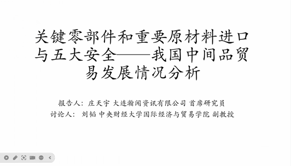 庄天宇研究员(大连翰闻资讯有限公司 首席研究员)做了题为《关键零部件和重要原材料进口与五大安全——我国中间品贸易发展情况》的研究报告: