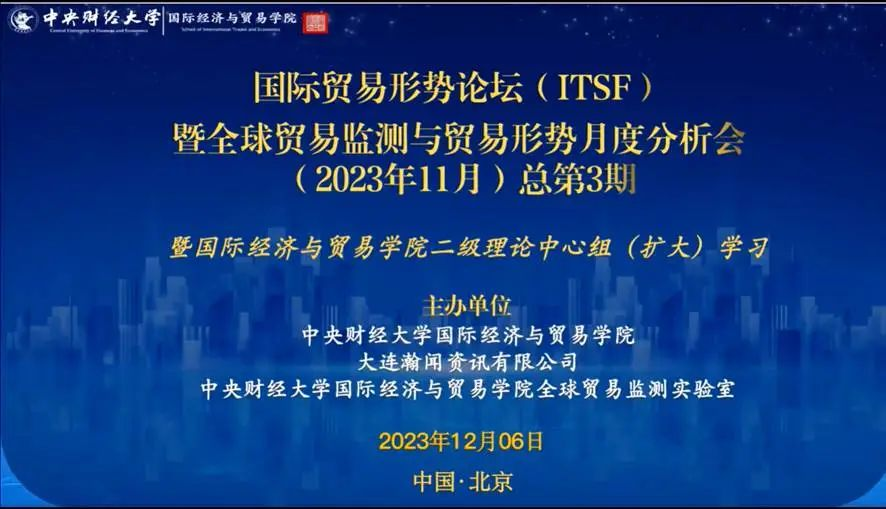 2023年12月6日,永利yl23411、大连瀚闻资讯有限公司、永利yl23411全球贸易监测实验室联合举办了国际贸易形势论坛暨全球贸易监测与贸易形势月度分析会(2023年11月)(总第3期)暨永利yl23411二级理论学习中心组(扩大)学习。来自永利yl23411、大连瀚闻资讯有限公司的特邀嘉宾及校内外师生近百人参与了本次线上会议。
