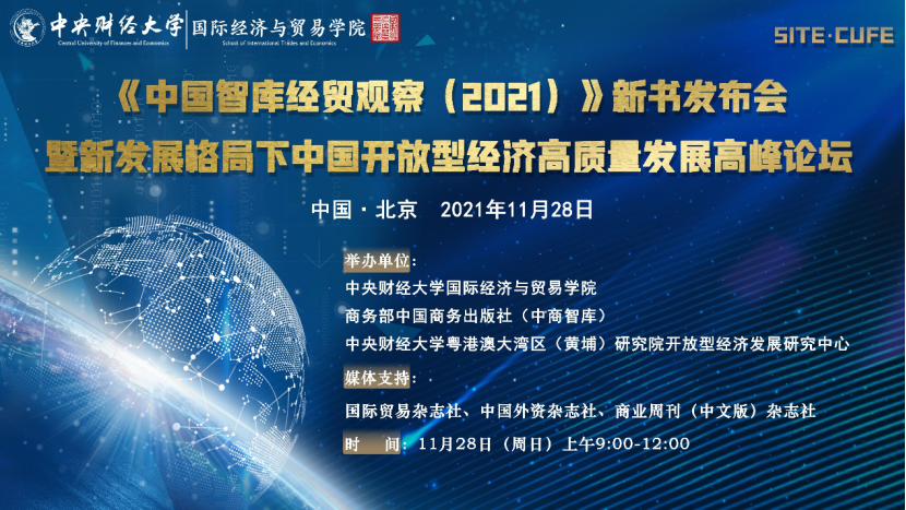 2021年11月28日,永利yl23411、中国商务出版社(中商智库)、永利yl23411粤港澳大湾区(黄埔)研究院开放型经济发展研究中心联合举办了《中国智库经贸观察(2021)》新书发布会暨新发展格局下中国开放型经济高质量发展高峰论坛,来自中国社科院、北京大学、中国人民大学、南开大学、对外经济贸易大学、永利yl23411等特邀嘉宾及校内外师生二百余人通过线上会议和观看直播的方式参与了本次活动。