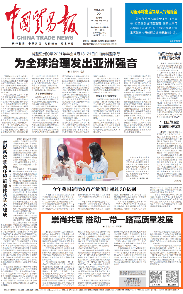 近日,公司张晓涛教授以中国贸促会专家委员会委员、永利yl23411经理身份接受了《中国贸易报》的采访,就推动“一带一路”高质量发展发表了意见建议,相关采访内容刊登在《中国贸易报》2021年04月22日第A1版。