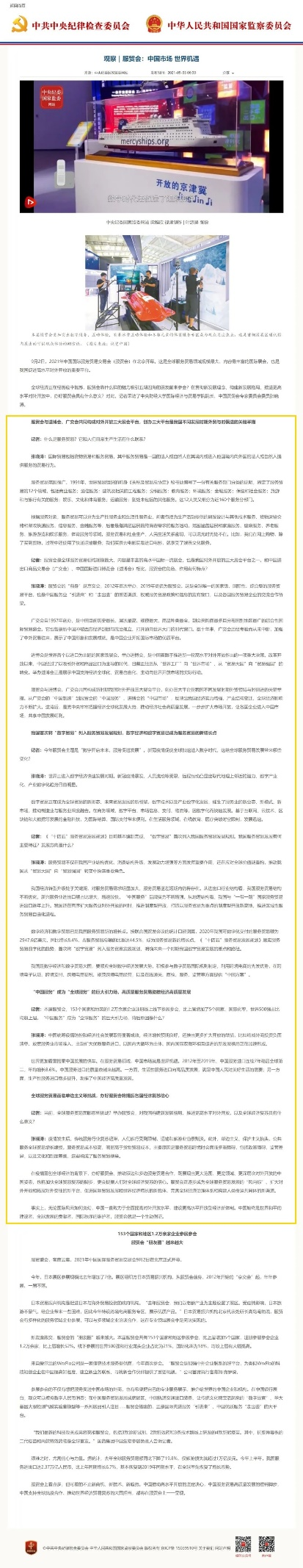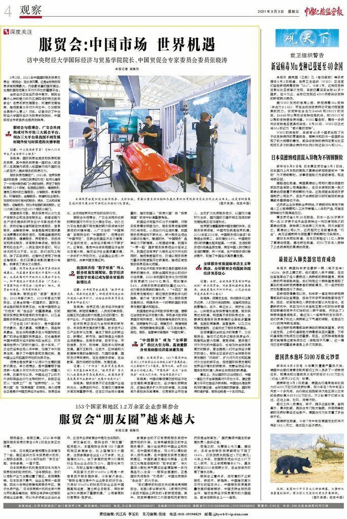 近日,公司张晓涛教授以永利yl23411经理、中国贸促会专家委员会委员的身份接受了中央纪委国家监委网的采访,就服贸会及中国对外开放发表了观点,相关采访内容刊登在中央纪委国家监委网站和中国纪检监察报2021年9月3日第4版。
