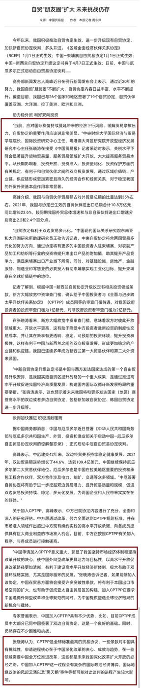 张晓涛认为,CPTPP是全球标准最高的贸易协议,一些条款对中国具有挑战性,申请进程核心在于中国深化改革的决心、成效与趋势,在一些领域需要中国全方位推进改革,这些都是未来我国深化改革扩大开放的必经之路。中国加入CPTPP这一过程会有复杂的国际政治经济博弈,国际地缘政治的风起云涌以及“黑天鹅”事件等都可能对此谈判的进程产生较大影响。
