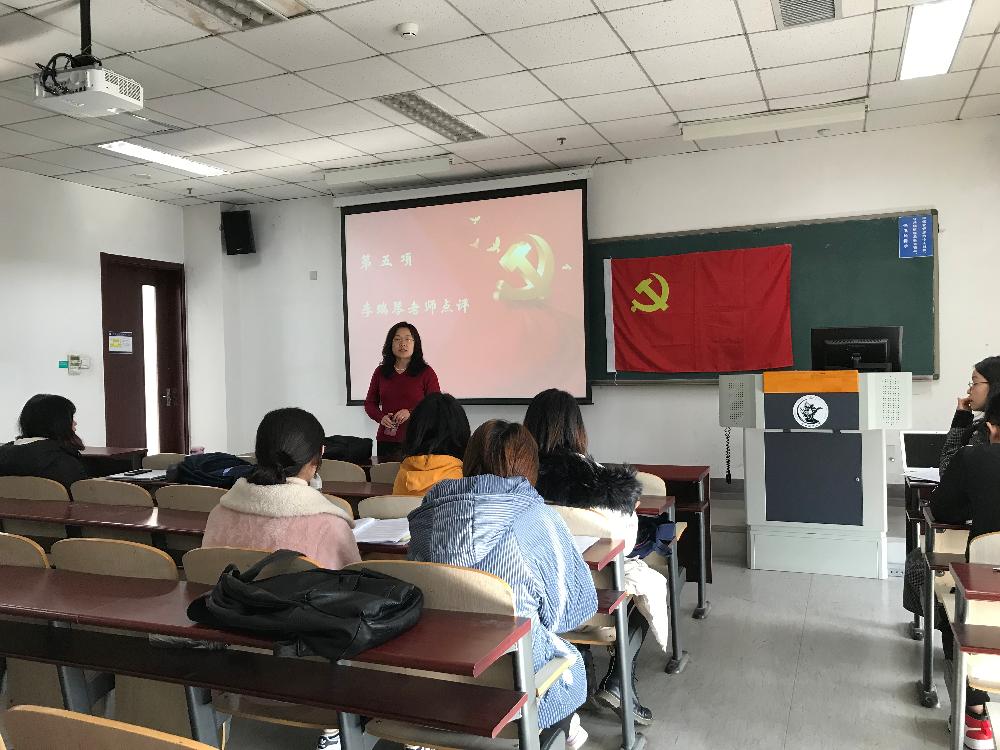活动的第一项是由党支部书记李季莲同志发言。李季莲同志在发言中总结了最近党支部的学习和实践情况:认真学习党的十九大精神,为开展主题教育做好准备。每日学习强国,利用微信、QQ等媒介积极开展线上小范围的集中学习,党员坚持上网查阅资料认真自学。组织观看红色电影、纪录片。先后组织党员观看《周恩来的一双布鞋》《外交风云》《决胜时刻》等专题视频。积极开展党支部书记讲党课、党员微课堂等集体学习活动。先后组织了新生运动会志愿服务、香山志愿服务,在点滴小事中践行为人民服务的宗旨。