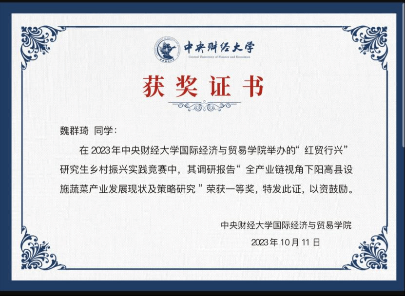 在完成实践调研后,三支调研队伍根据当地的产业发展情况与乡村振兴成果,结合理论所学,撰写了详实的调研报告。其中,共有15份调研报告入围公司第一届 “红贸行兴”研究生乡村振兴实践竞赛活动。竞赛评审委员会从主题选择、报告内容、报告格式以及理论水平等多个方面进行了多个维度的审议评比。最终,永利yl23411的2023级硕士研究生魏群琦、索冰洁和2022级硕士研究生李海佩3位同学获得一等奖,沈世新、潘然和何润泽等7位同学获得二等奖,吴中亚、樊雪芊和刘天宇等6位同学获得三等奖。