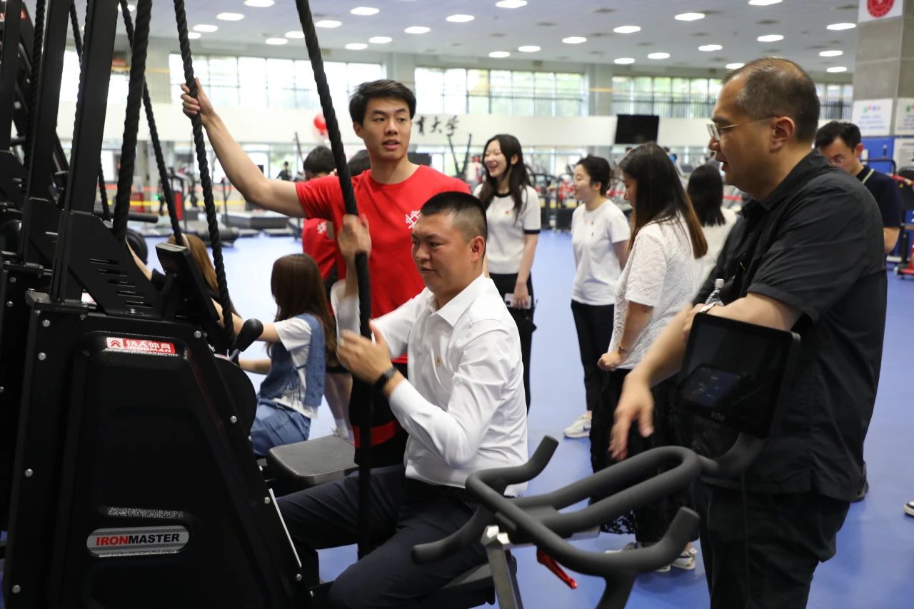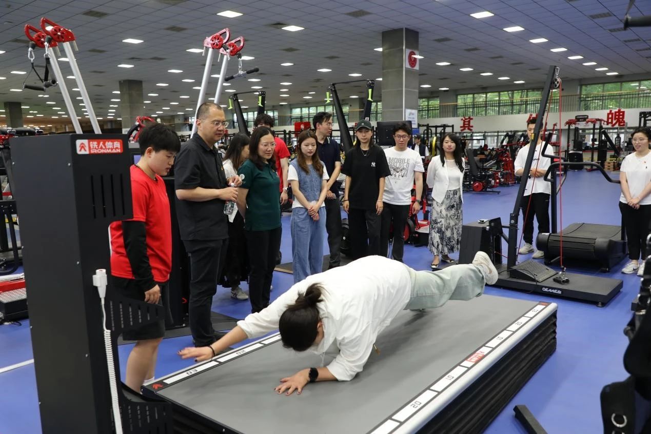 北体大的老师和同学带领与会师生前往网球综合训练馆一层的健身馆参观体验。“文明其精神,野蛮其体魄”的北体大校训映入眼帘。带队师生耐心为大家教学讲解每个健身器械的使用方法和主要功能,在专业老师的指导和演示下,师生亲身体验高科技体能评估器材,惊叹于体育和科技融合的魅力。在乒乓球训练场,由专业的乒乓球运动员指导动作,寓教于乐,带领师生体验专业的训练过程,身临其境的感受专业体育训练的过程和青春活力的氛围。