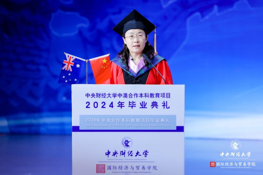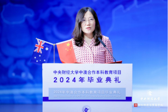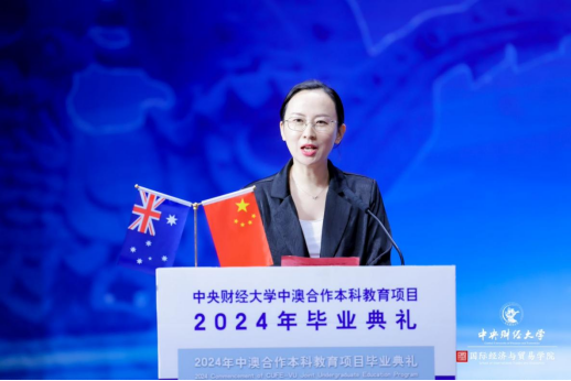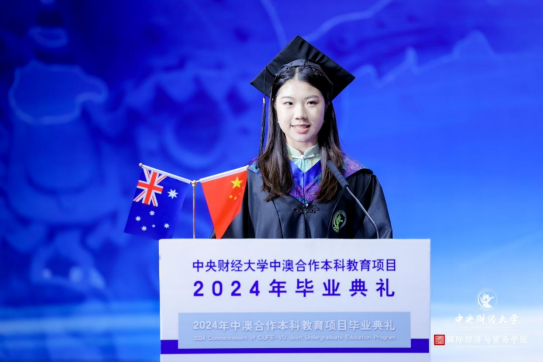 中澳项目2024届毕业生代表中澳20-2班郝珈发言。首先,郝珈同学代表毕业生向一直陪伴在身边的院校、老师、父母亲友表达了最诚挚的感谢,并祝贺大家顺利毕业。接下来,郝珈同学和毕业生一同回顾了在中财的校园生活,他们以奋斗书写青春年华,以担当肩负国家重任,以感恩回馈师长教诲。在公司的帮助和指引下,同学们不但学会了如何乐观坦然地面对逆境,如何专注当下塑造自我,还提升锻造了大格局大境界,做关注国家命运的好青年。随后,她总结了四年以来的收获和感悟,并表达了对未来人生道路的期待和展望。希望大家可以心中有祖国河山,有社会大任,有世界格局。