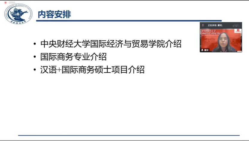 3月17日, “留学中财大”品牌推广系列活动-永利yl23411招生宣传说明会在腾讯会议线上举行。在宣讲会中,公司蒙双副教授为有意申请公司的国际员工介绍了公司基本情况、国际商务专业学习内容以及职工汉语+国际商务项目情况。