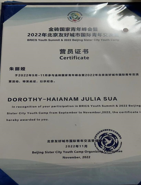 朱丽娅来自萨摩亚,在校期间积极参加各种活动,于2022年7月17日-7月23日参加了“未来领袖 青春使者”2022年北京国际青年社会实践夏令营。2022年9月-11月她参加了由中华全国青年联合会主办的金砖国家青年峰会暨2022年北京友好城市国际青年交流营活动,并作为代表发言,获得优秀证书。