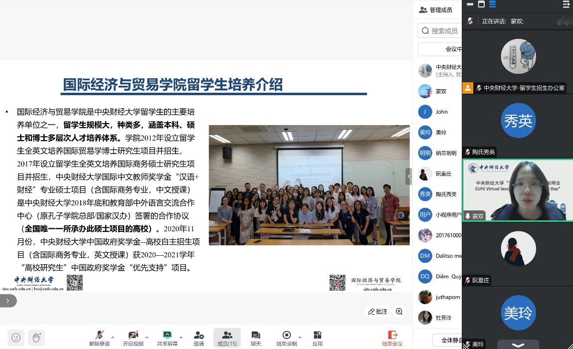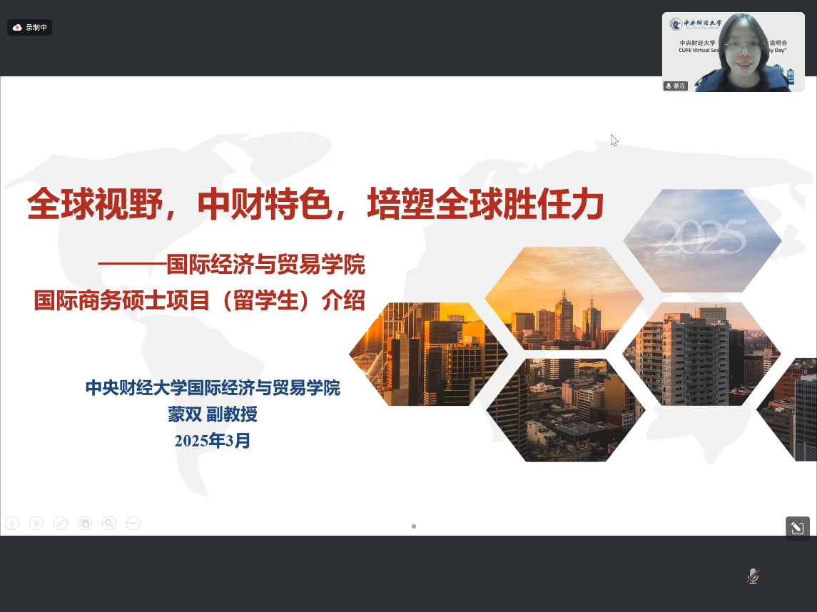2025年3月7日,“留学中财大”公司日-永利yl23411线上招生宣传说明会在腾讯会议举行。公司蒙双副教授为有意申请公司的国际员工介绍了公司基本情况、公司职工培养成效、国际商务专业学习内容以及职工“汉语+国际商务”项目情况。